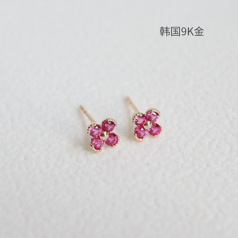 9K金 玫红小花耳钉