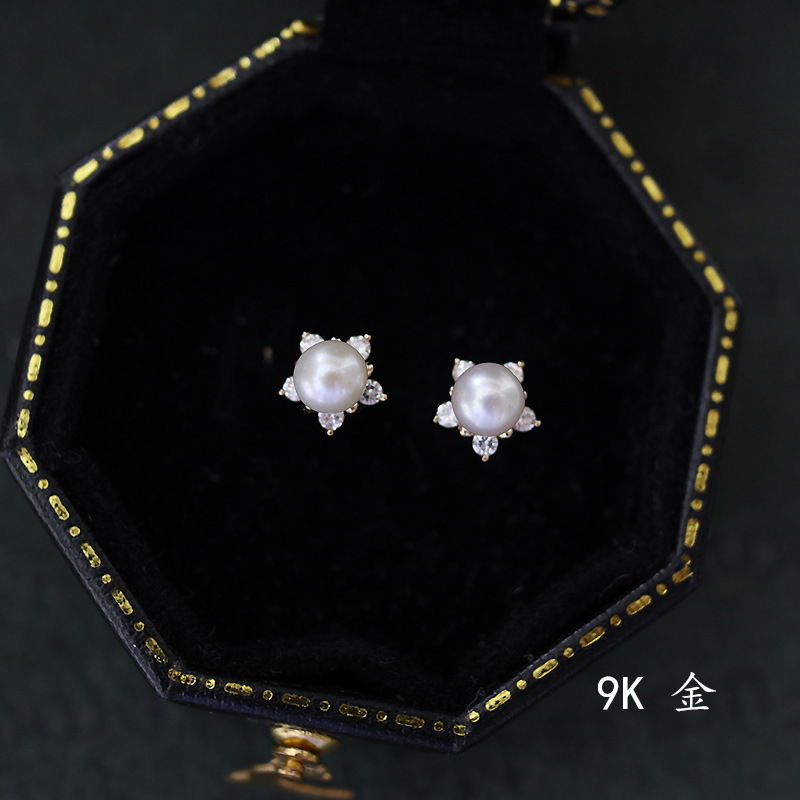 9K金 四方花纹珍珠耳钉耳饰