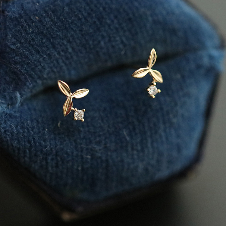 9K金 三片叶子小钻耳钉