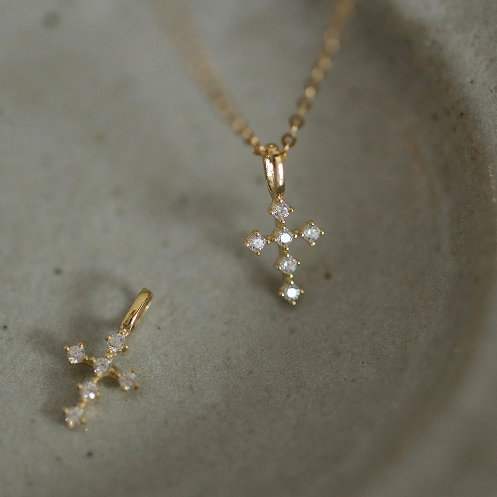9K金 精致日系镶钻十字架吊坠